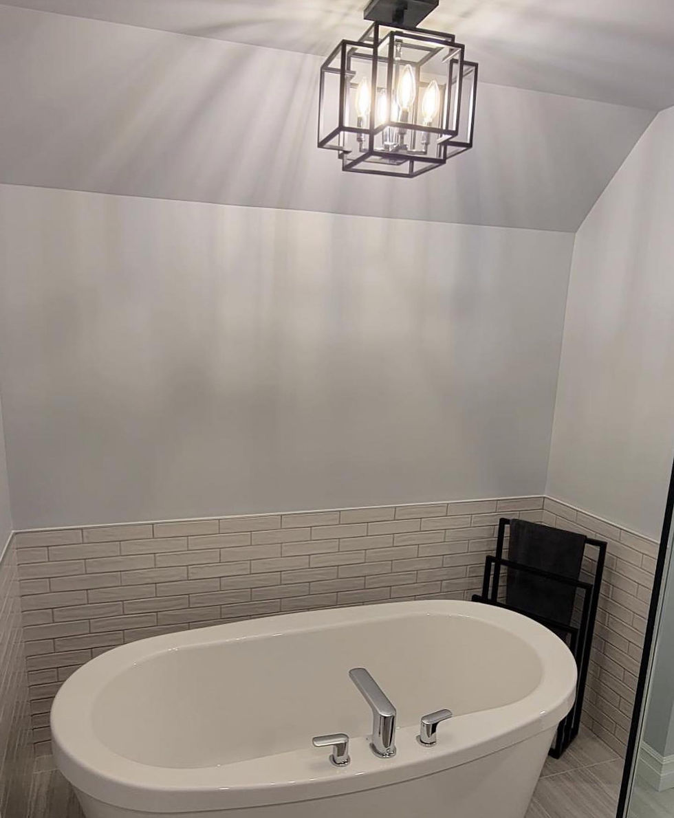 Bathroom renovation featuring a new vanity, tub, updated fixtures, and paint.